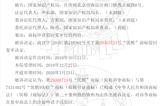 商标局依法驳回了优酷网的商标申请,优酷网不服将国家知识产权告上法庭。2020年3月,北京知识产权法院审理了该案件。