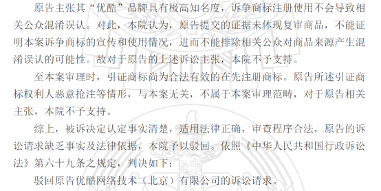 而优酷网申请的“优酷”商标与引证商标“优酷YOUKU”在汉字部分相同,呼叫及整体视觉效果方面相近,且两者都是注册在第17类,核定使用的商标构成同一种或类似商品。综上,法院驳回了优酷网的诉讼请求。