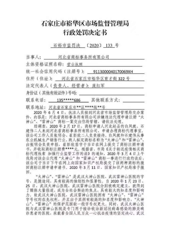 因违法代理“雷神山”“火神山”等商标注册,并违反了《中华人民共和国商标法》第十九条第三款:“商标代理机构知道或者应当知道委托人申请注册的商标属于本法第四条、第十五条和第三十二条规定情形的,不得接受其委托。”和《中华人民共和国商标法》第三十二条:“申请商标注册不得损害他人现有的在先权利,也不得以不正当手段抢先注册他人已经使用并有一定影响的商标。”之规定,构成违法代理申请注册商标行为。河北省商标事务所有限公司被河北省市场监督管理局处以3万元处罚。